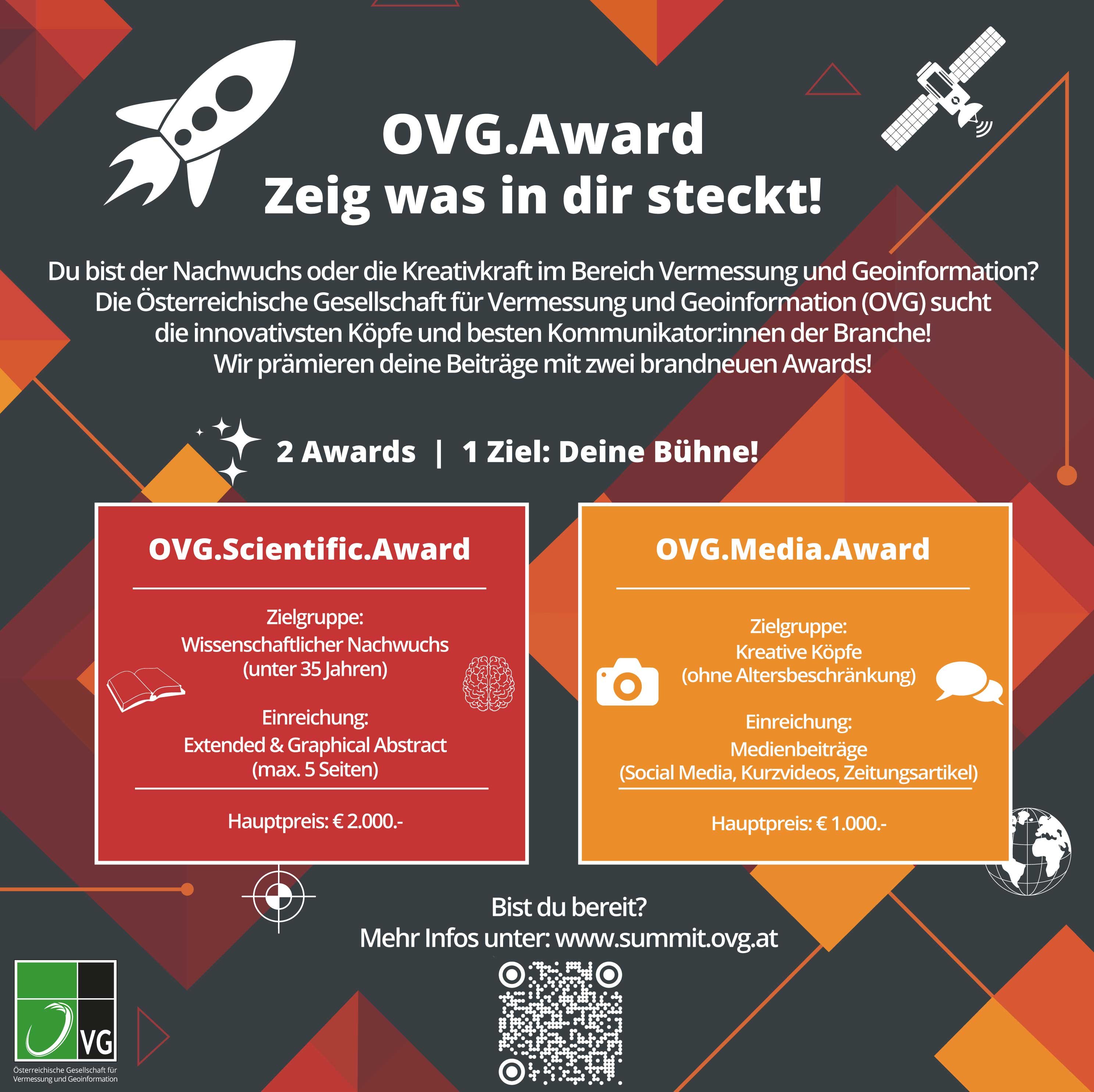 Die Österreichische Gesellschaft für Vermessung und Geoinformation (OVG) sucht die innovativsten Köpfe und die besten Kommunikator:innen der Branche! Wir prämieren deine Arbeit mit zwei brandneuen, unkomplizierten Awards.